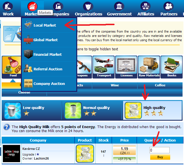 Takto to robte až si našetríte aspoň 3 SKK. Hneď potom si musíte kupiť mlieko ( upozorňujem najvyšej kvality - Q 3 ) a až potom začnite frigtovať ! Môžete kúpiť maximálne 1 mlieko za 24 hodín. Mlieko Vám pridá 6 bodov energie čim sa Vám zvýši produktivita , takže budete zarabať viac SKK aj EUR